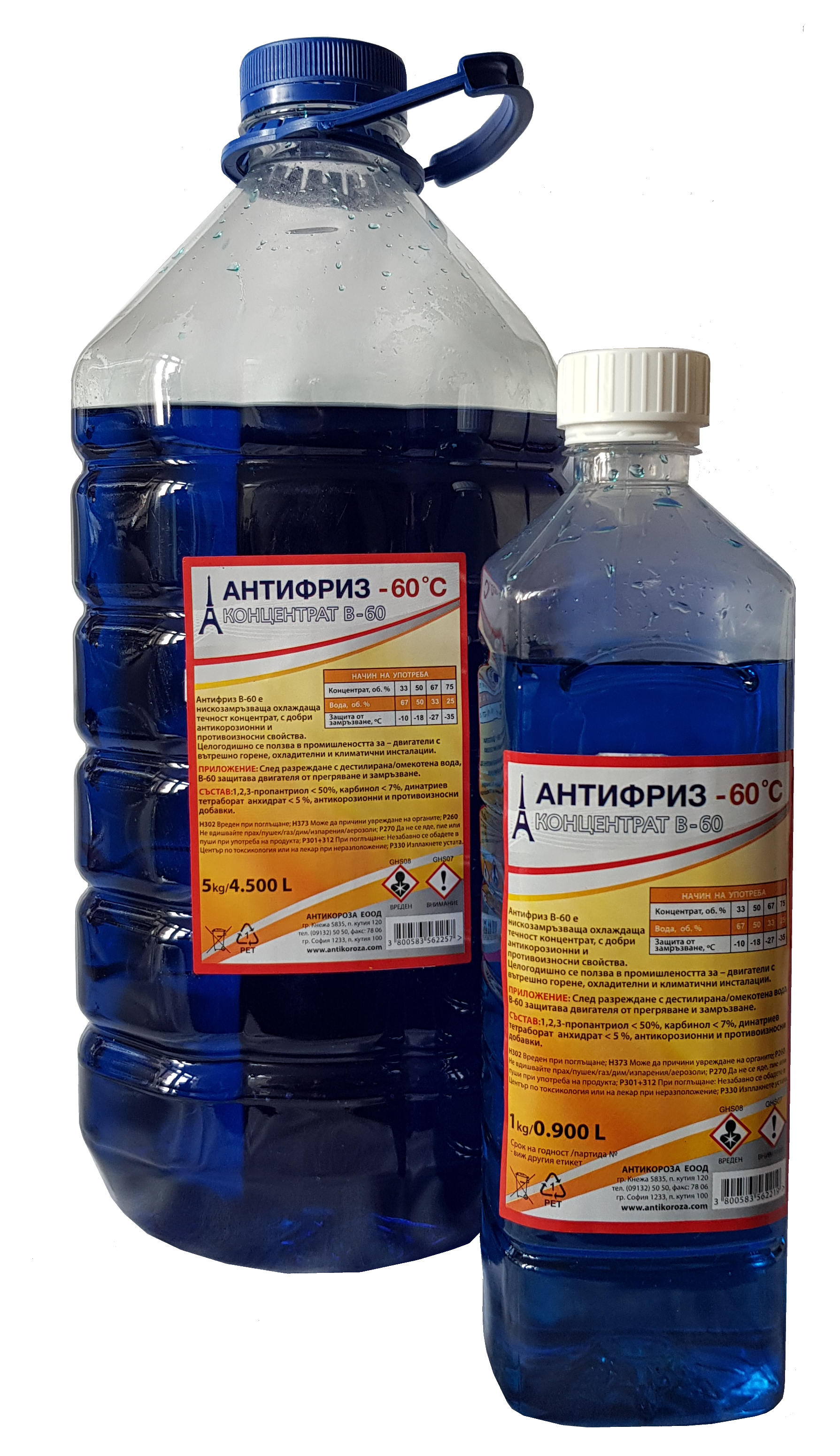 Антифриз син концентрат -60°С. «В -60» е с модерна «зелена» технология. Той е по-малко отровен от изцяло MEG базираните антифризи. Съдържа инхибитори за защита от корозия на черни и цветни метали, с борати и силикати. Не уврежда гумени и силиконови маркучи и уплътнения.