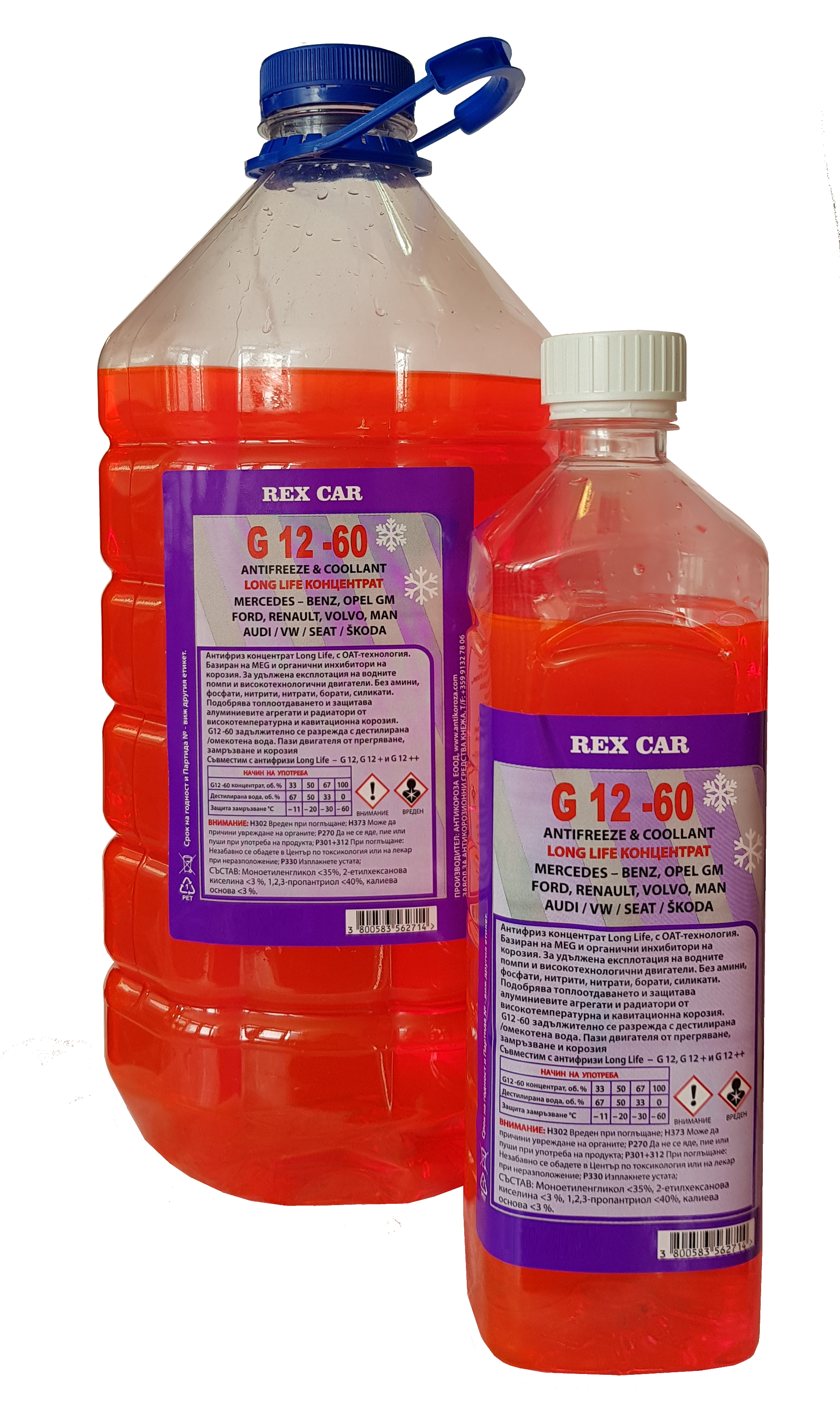 Антифриз Червен концентрат G12 -60°С long life , с ОАТ технология. За удължена експлоатация на водните помпи и високо технологични двигатели. Без амини, нитрати, нитрити фосфати,богати и силикати. Подобрява топлоподаването и защитава алуминиевите агрегати и радиатори от високо температурна и кавитационна корозия. G12 -60°С long life  задължително се разрежда с дестилирана вода. Пази двигателя от прегряване, замръзване и корозия.
